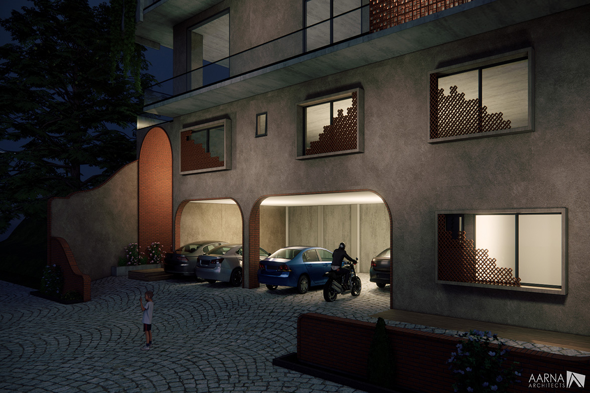 To design a guest house for pilgrims and relatives of the donor. The built form should have the capacity to accommodate 6 families, their cars, drivers, and domestic help. Accommodation for a permanent caretaker with family had to be provided. The plush Penthouse had to be designed for the use of the primary donor only.
