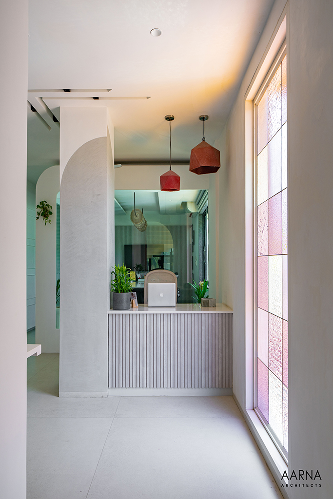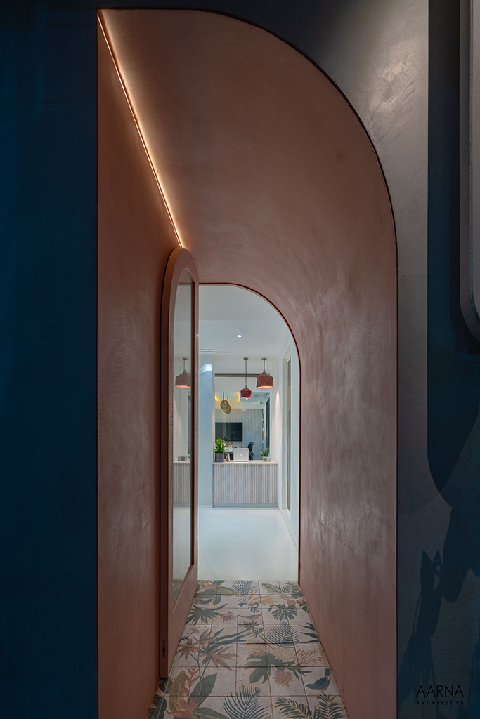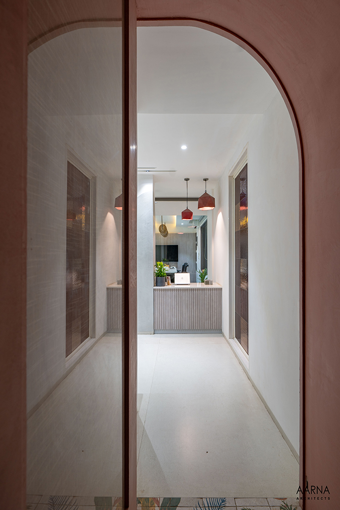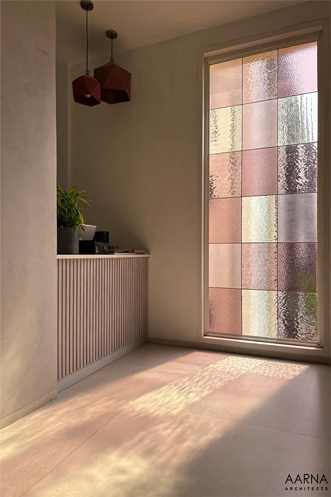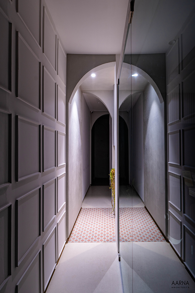 Thought Process intended and directed us to break the monotony of the narrow linear spaces through profound geometry with the natural effect of light and shade through caustic refraction, vibrant patterns, textures and forms to create interest and drama.  Subsequently, our concept evolved ensuring space optimization, while creating architectural illusions of volume, larger than physically available.