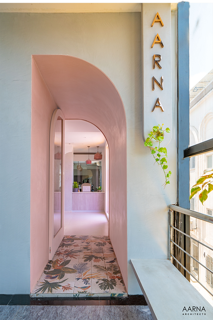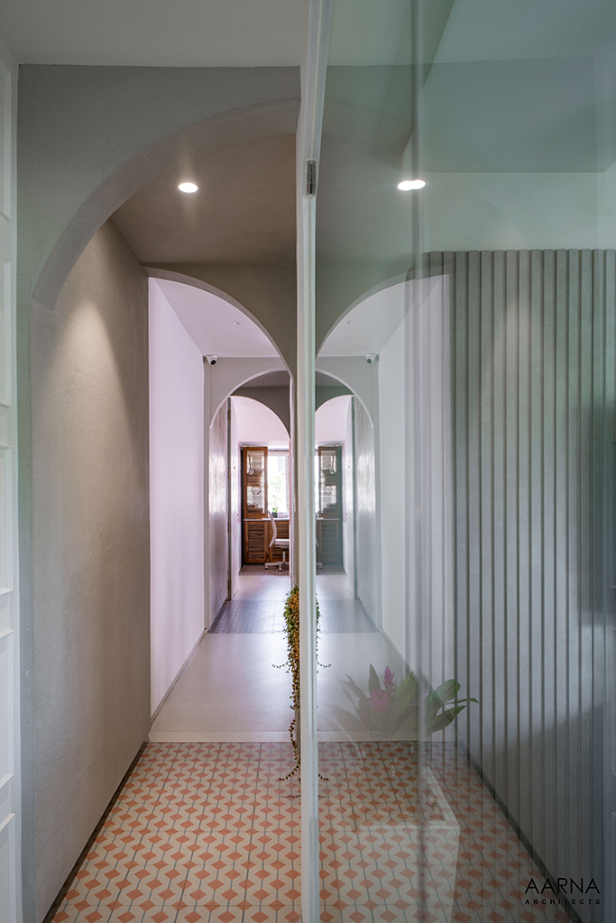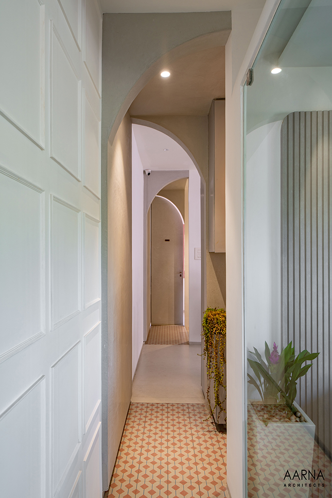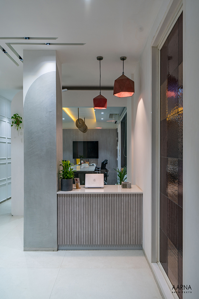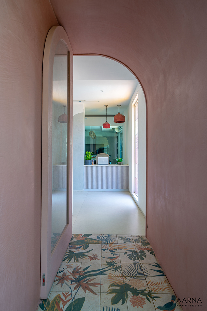 Thought Process intended and directed us to break the monotony of the narrow linear spaces through profound geometry with the natural effect of light and shade through caustic refraction, vibrant patterns, textures and forms to create interest and drama.  Subsequently, our concept evolved ensuring space optimization, while creating architectural illusions of volume, larger than physically available.