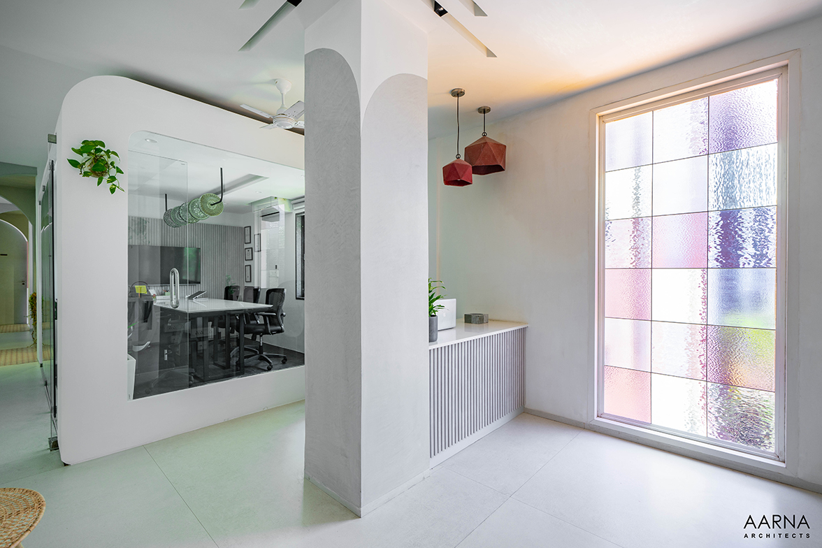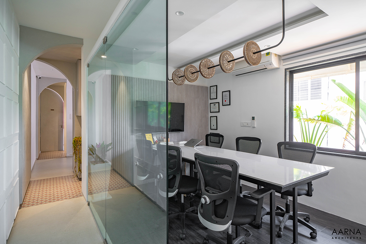 The Atelier is carved out on the west side of a larger floor slab on the second level of a multi-storied commercial building on a prime road in Hyderabad.