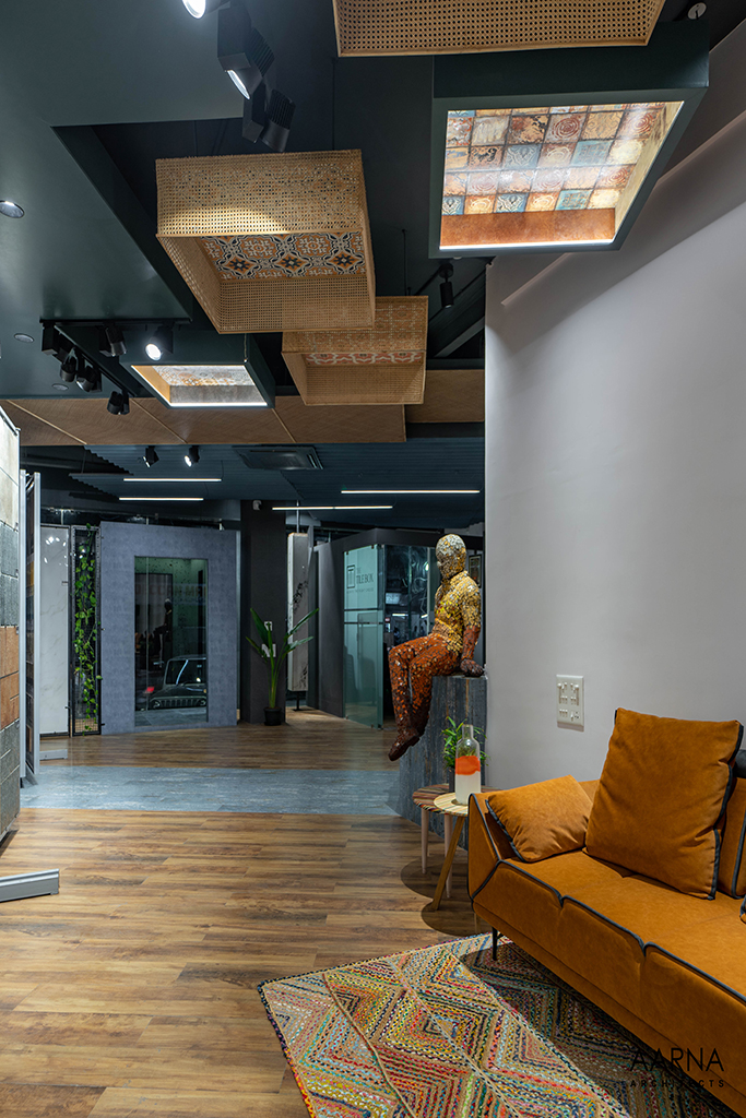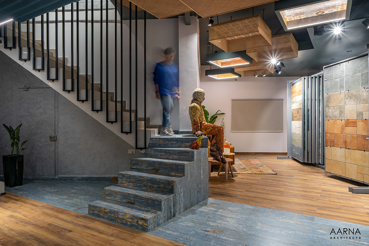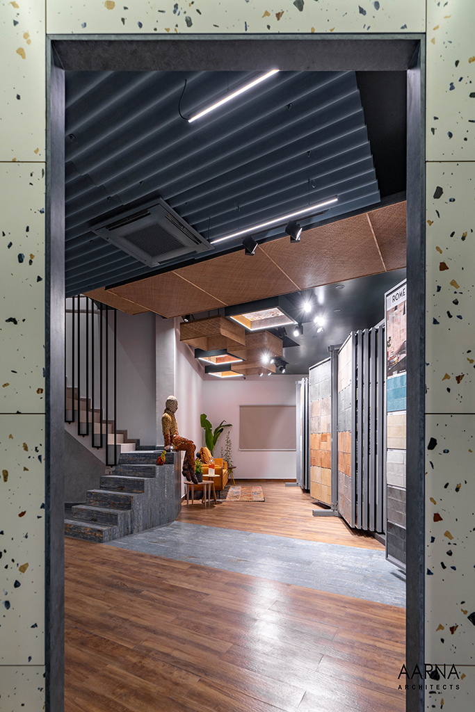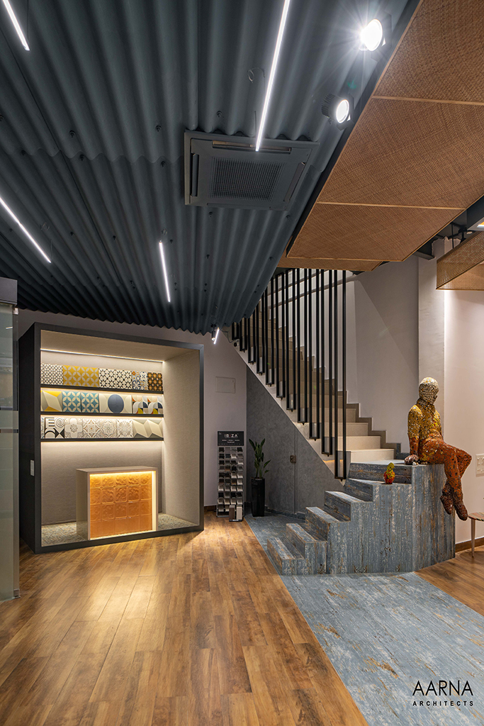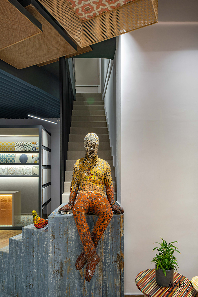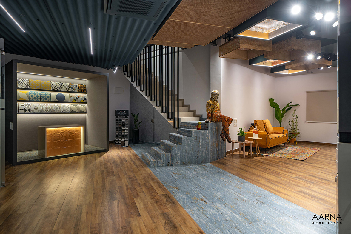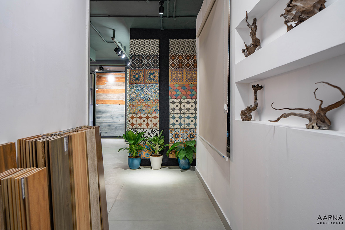 The movement path to be taken by customers was planned through a series of engaging installations namely the entrance Box-clad in a combination of terrazzo finish tiles, and the show box which displays smaller exotic easy-to-handle tiles. the ceiling boxes and the railing boxes which host tiles and the mock-up bays on the first floor which are life-size replicas of liveable spaces allowing the customers to experience the actual utilization of the tiles.
