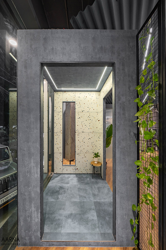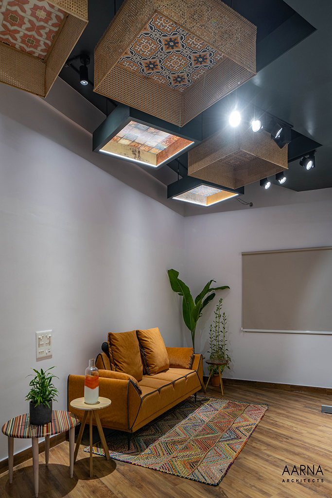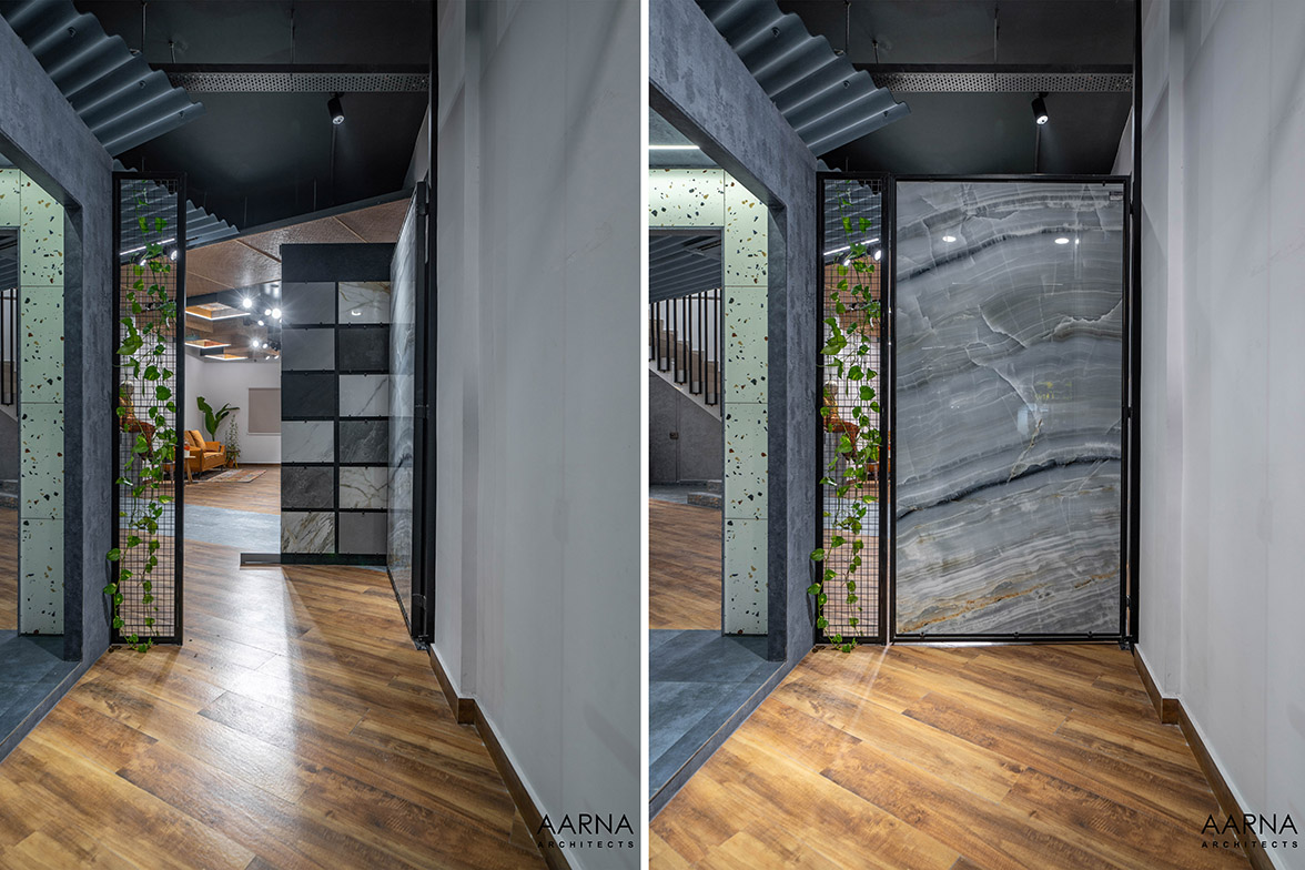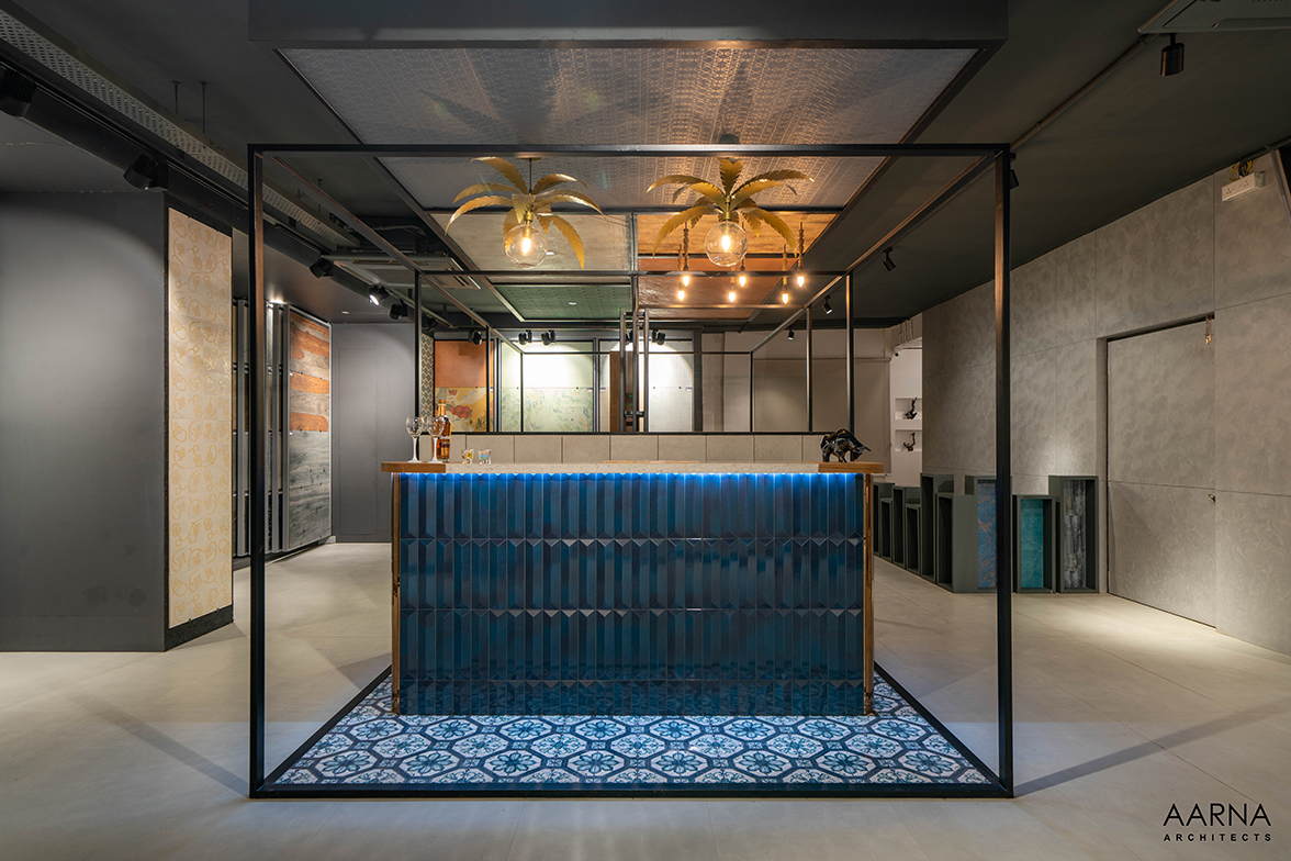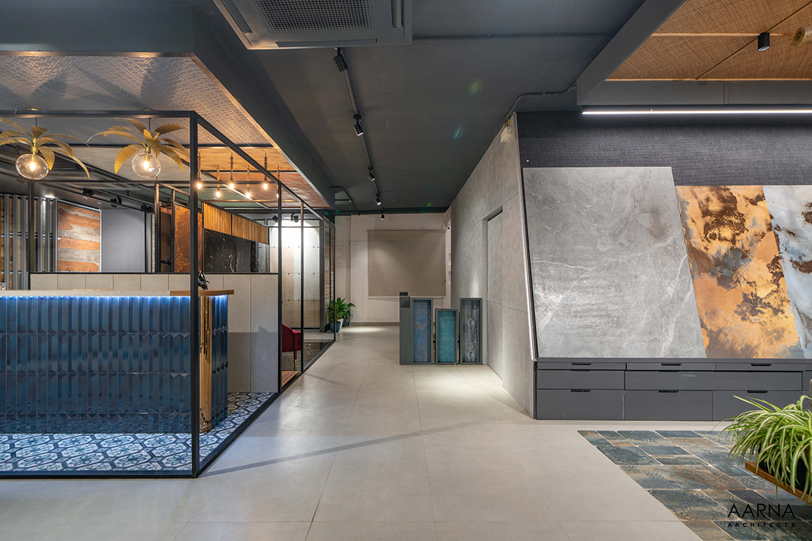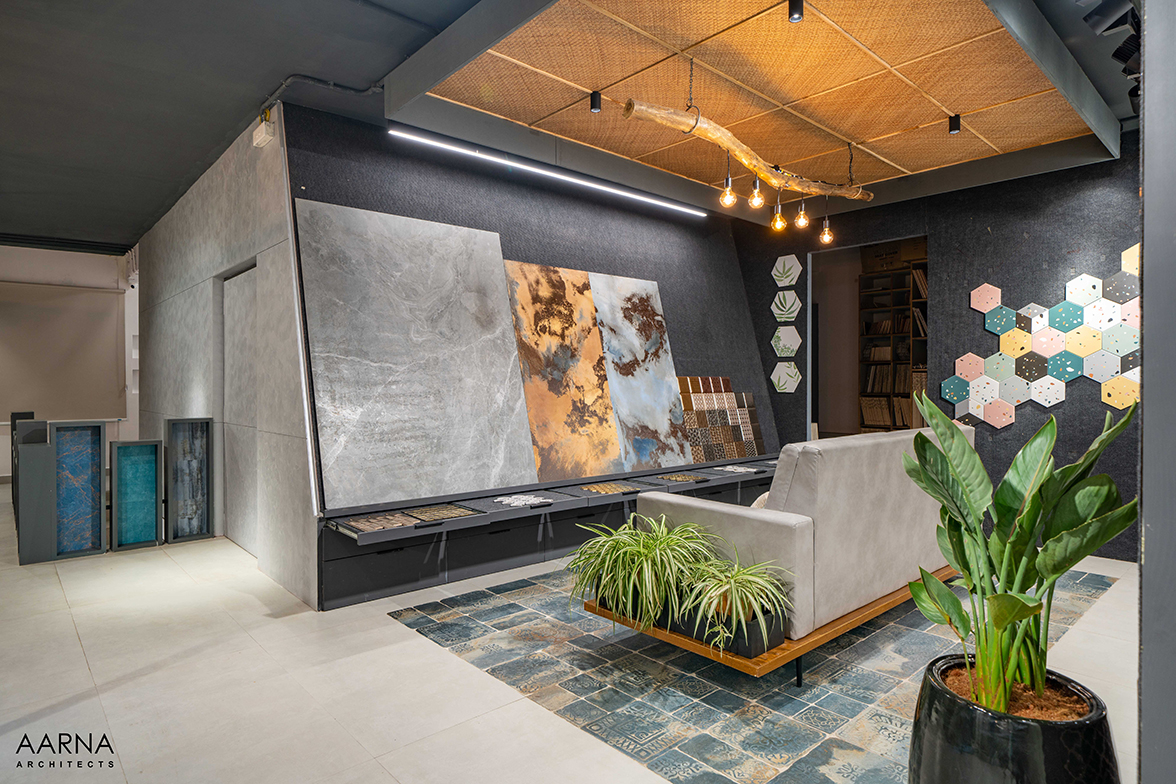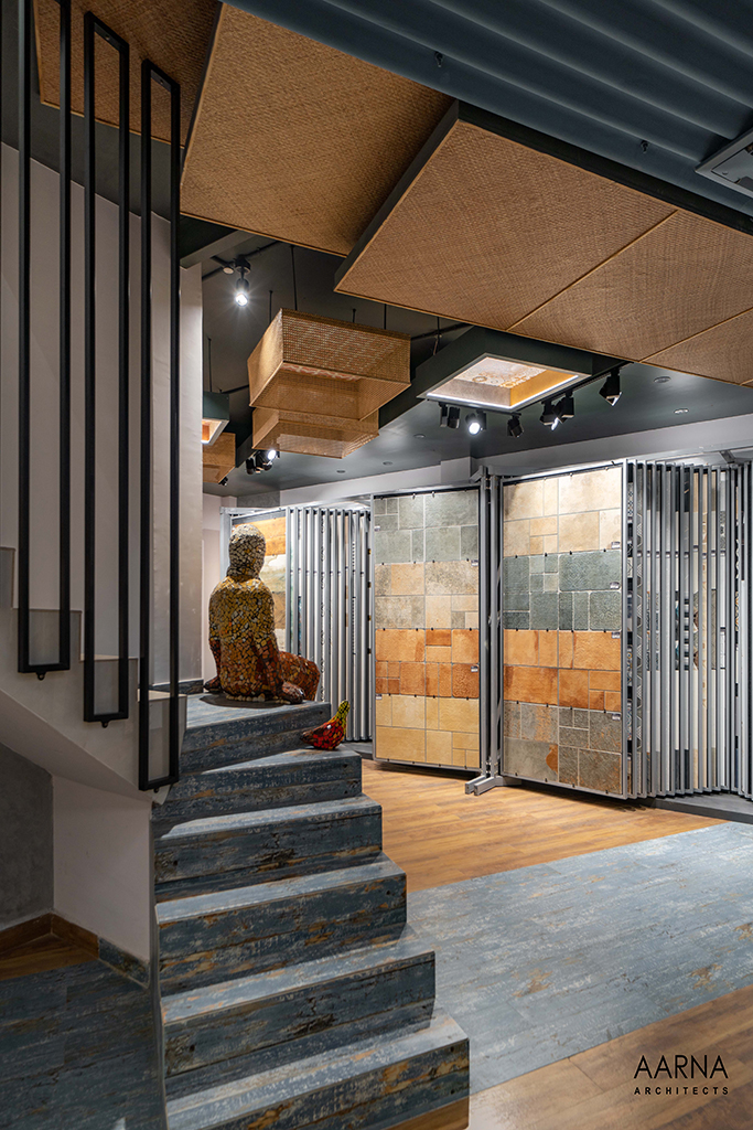 The movement path to be taken by customers was planned through a series of engaging installations namely the entrance Box-clad in a combination of terrazzo finish tiles, and the show box which displays smaller exotic easy-to-handle tiles. the ceiling boxes and the railing boxes which host tiles and the mock-up bays on the first floor which are life-size replicas of liveable spaces allowing the customers to experience the actual utilization of the tiles.